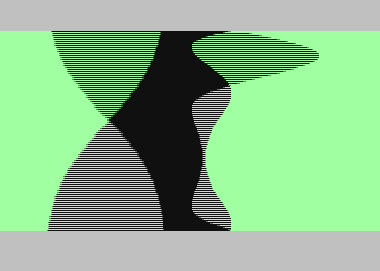 Another never-seen-before part, the XOR-part. 2 vertical and 2 horizontal lines and the text are scrolling unregulary over the screen and inverting the colors.