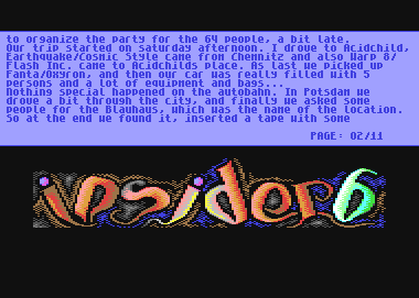 It was released in march 1996. Well, we needed a whole night (like always ;-) ) to finnish it. When we stopped it only needed to be saved on the disc. But it was a really big issue, nearly too big for 1 disc. I came home in the early morning and started saving all the 66 blocks of the main file with an machine-monitor on the disc, some blocks on track 18.