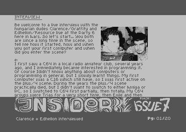 Syndrom/Crest had coded a new outfit for this issue with proportional charset and the capability of displaying pictures with the text. Whilst I had been the maineditor of most of the previous issues I had lost the motivation a bit and I also had a stressy life with my work at that time. So the articles in Insider 7 are written by many different people. Thanks to all...