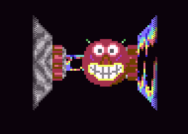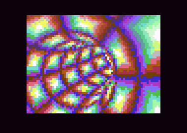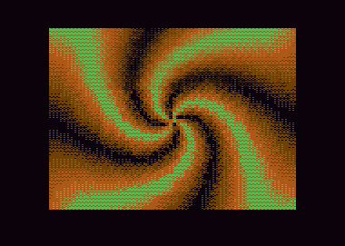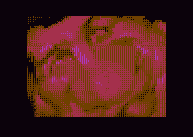 Kinda like a chessboard is moving over a scrolltext and inverts the colors. This part could be compared with the eor-part in Cafe Odd, our demo 2 years ago, but this time in hires with 4 colors. Impossible... |