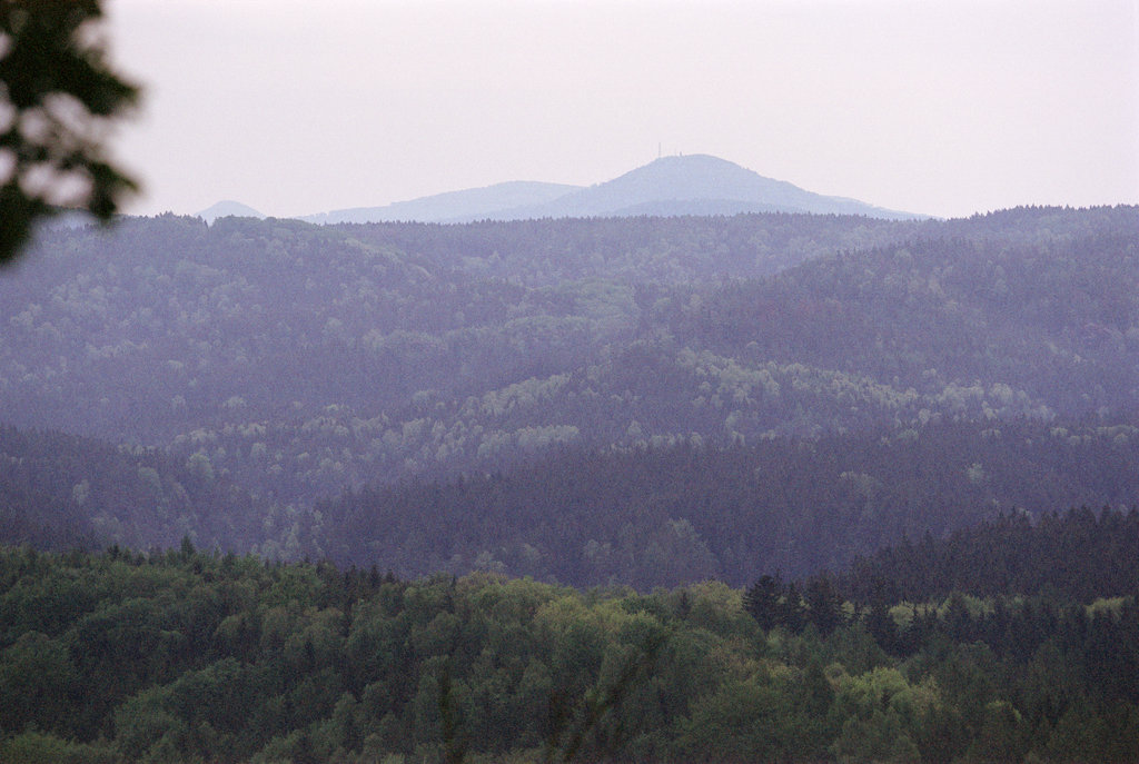 Panorama vom Lilienstein Richtung Bad Schandau, zu sehen sind der Große Winterberg, Kaiserkrone und Zirkelstein, dahinter der Rosenberg, dann Richtung Kohlbornstein und Kleinhennersdorfer Stein, Papststein und Gohrisch, im Vordergrund Stadt Königstein an der Elbe