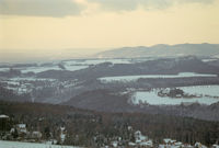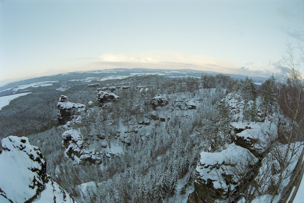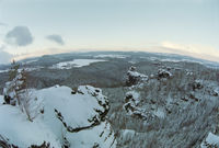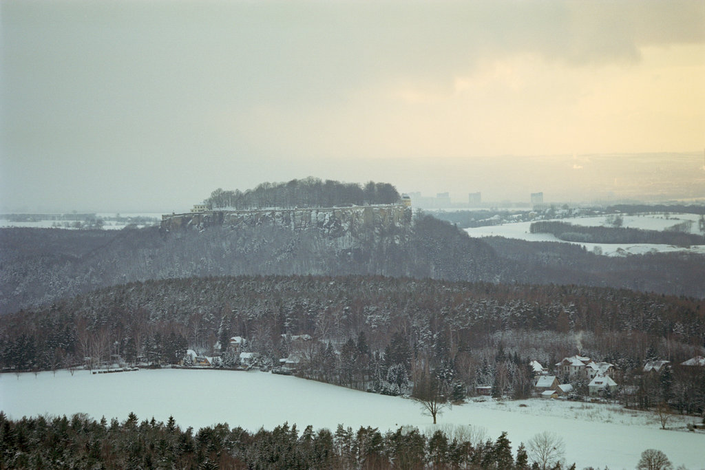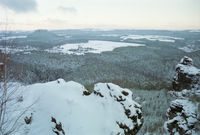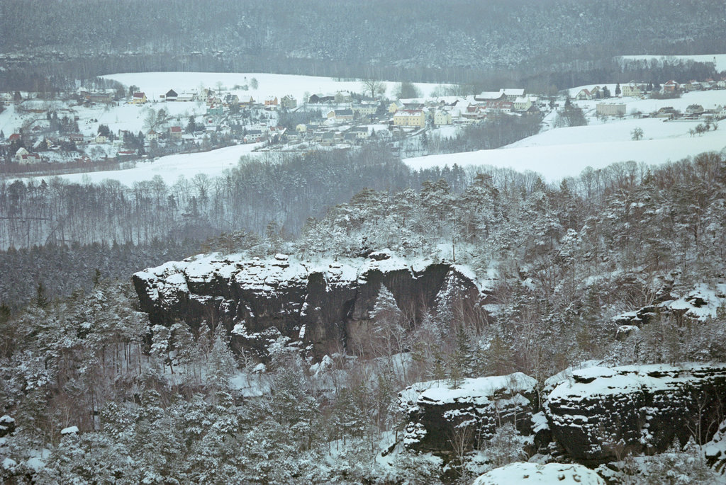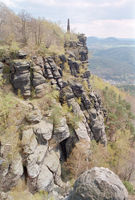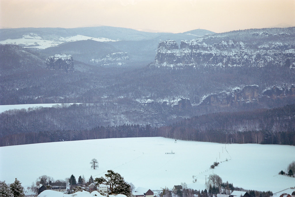 Blick vom Pfaffenstein zum Gohrisch sowie dahinter fast vollständig verdeckt der Papststein
