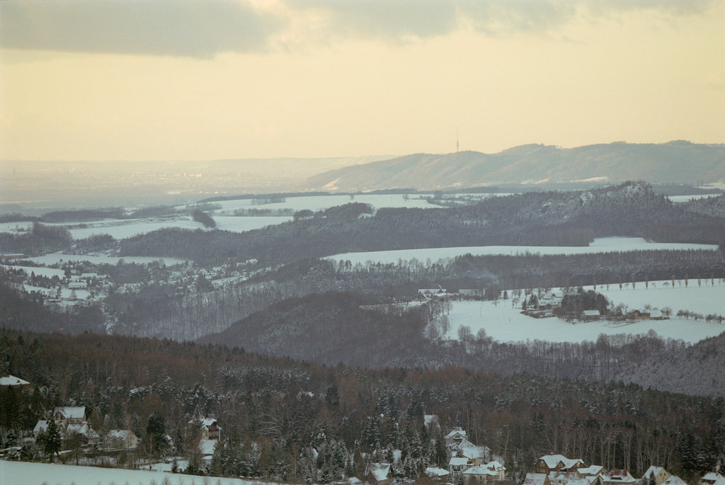 Blick vom Papststein Richtung Dresden mit den Elbhängen und dem Fernsehturm, rechts im Bild die Bärensteine