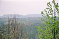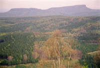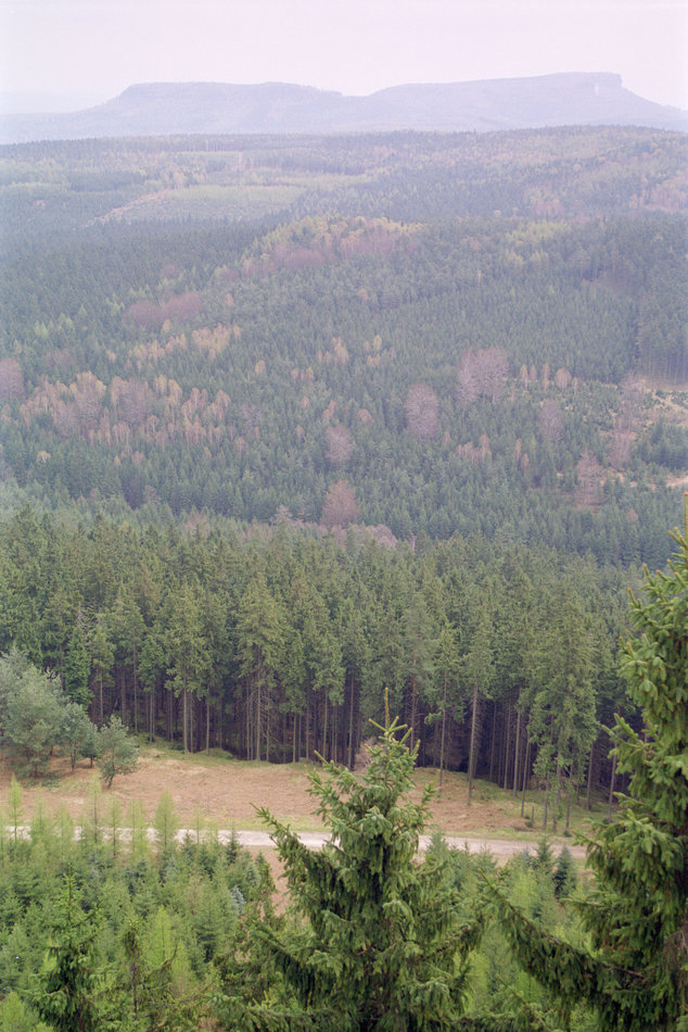 der Große Zschirnstein, aufgenommen aus einem Wald bei Cunnersdorf, danebend der Rosenberg