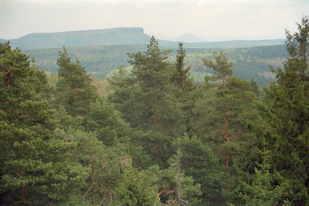 Blick vom Aussichtsturm auf dem Pfaffenstein, Panorama mit den Tafelbergen, ua. Gohrischstein und die Zschirnsteine