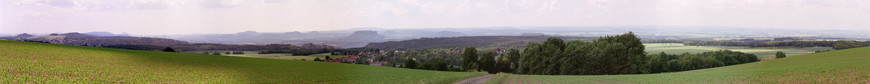 Blick vom Hohburkersdorfer Rundblick: Lužické Hory, Winterberg und Schrammsteinkette, Rosenberg, Kaiserkrone und Zirkelstein, Zschirnsteine, Papstein, Gohrisch und weitere Tafelberge, Felsgruppe um die Lokomotive bei Rathen im Vordergrund, Lilienstein und Hoher Schneeberg, Pfaffenstein, Festung Königstein, der Osterzgebirgskamm im Hintergrund und Pirna-Sonnenstein