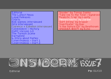 Syndrom/Crest had coded a new outfit for this issue with proportional charset and the capability of displaying pictures with the text. Whilst I had been the maineditor of most of the previous issues I had lost the motivation a bit and I also had a stressy life with my work at that time. So the articles in Insider 7 are written by many different people. Thanks to all...